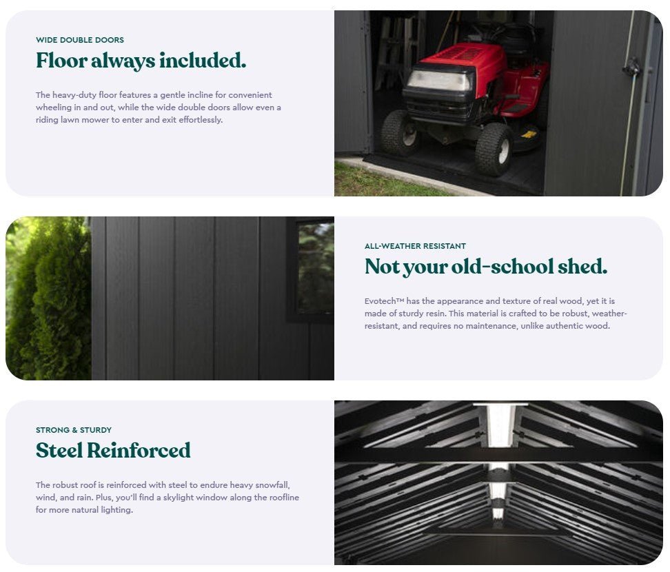 Newton sheds feature panels made from Evotech+, an advanced and innovative Wood-Look plastic composite, giving you the aesthetic appeal of real wood, without the headache of ongoing maintenance, It offers the natural beauty of a real wood finish while saving you the hassle of coatings and repairs.