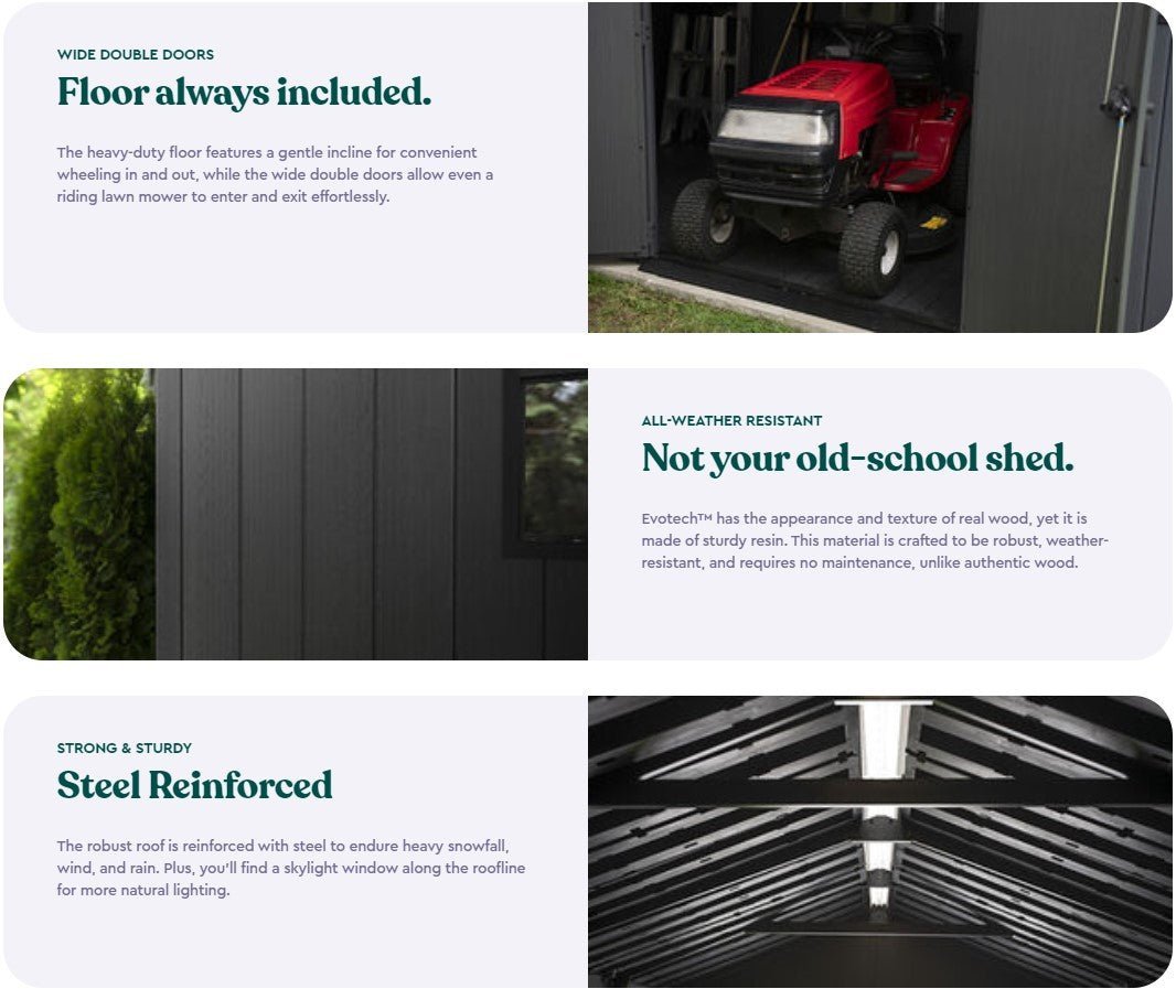 The Newton Plus Storage Shed 7.5×9 ft. in sleek grey from Keter is the ultimate large shed storage solution. It’s not just a shed; it’s your shed, your way! Whether you’re storing large items or need easy access to your belongings, this outdoor storage shed has got you covered. Crafted with innovative Evotech+ panels, it perfectly replicates the look and feel of natural wood without the hassle of maintenance. With a sturdy floor keeping your belongings elevated and vents promoting airflow, this outdoor storage shed covers all the bases. Say goodbye to rust, rot, and peeling—this outdoor storage shed is built to last. Elevate your outdoor storage game with the Newton Plus Shed and enjoy both style and convenience in one.