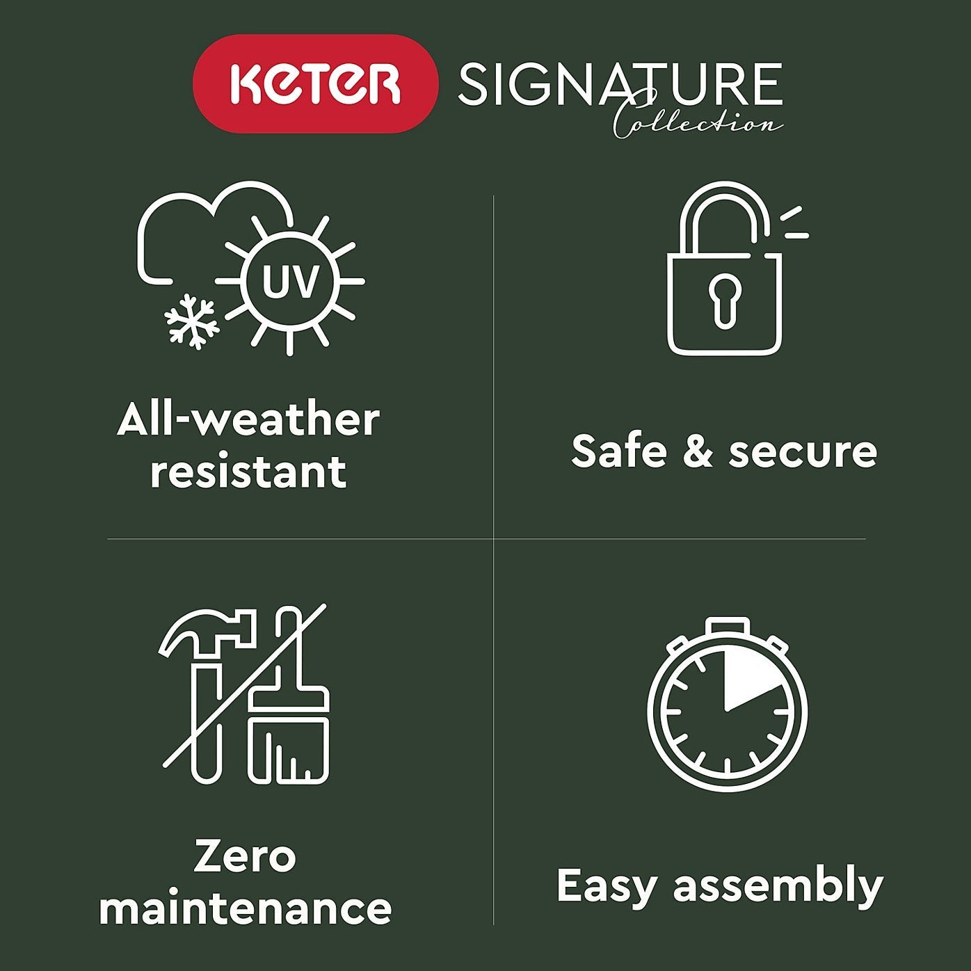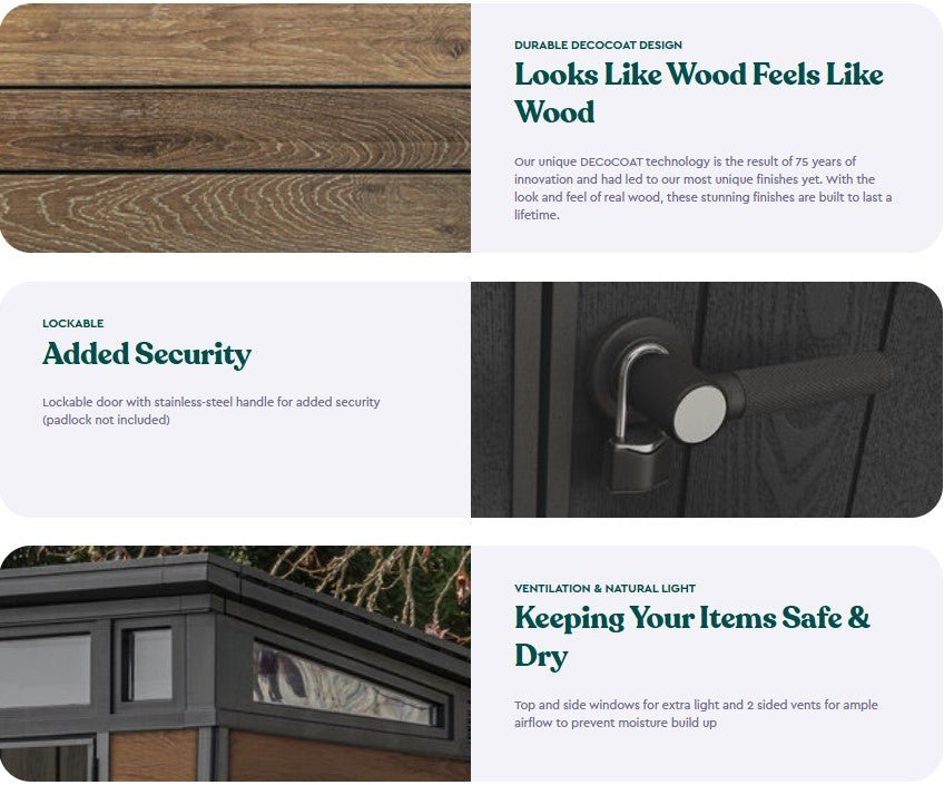 Large outdoor storage doesn’t get any more premium than the Pent 11×7 storage shed, part of Keter’s Signature Collection. Its walls are constructed with our innovative, cutting-edge material that won’t chip, peel, flake, rot, or sustain any water damage.